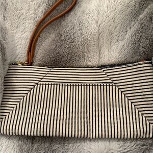 Maurices Navy and Cream Canvas Striped Wristlet with brown handle