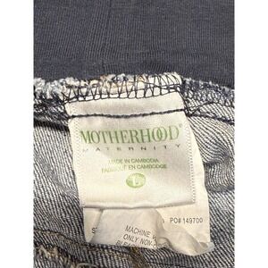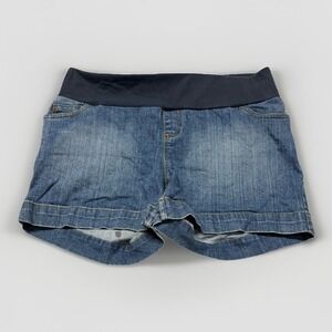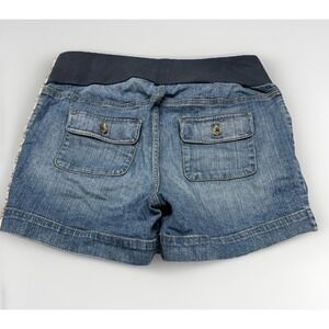 These Motherhood Maternity shorts feature a denim construction with a comfortable elastic waistband, providing a relaxed fit for expecting mothers. Designed with cargo-style back pockets, they combine practicality with classic maternity wear aesthetics.