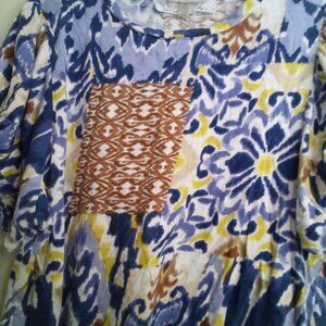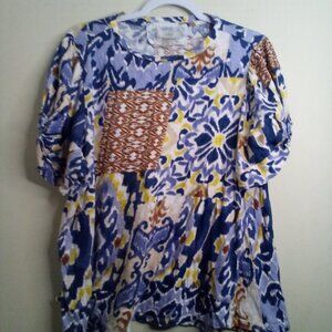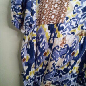 Cupio Blouse Women 2X Short Sleeve Soft Pattern Blue Brown Yellow