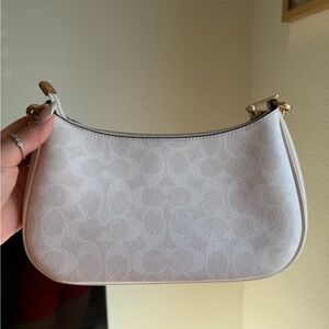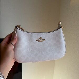 Stylish Coach shoulder bag in ivory. Features gold chain details. Ideal for versatile wear.