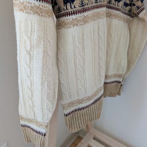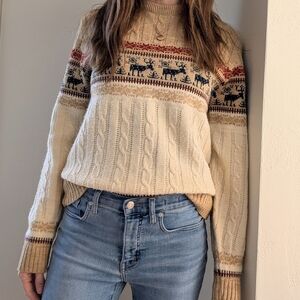 Vintage Reindeer Geometric Chunky Cable Knit Wool Sweater In Cream/Navy