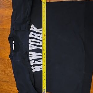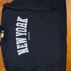 Black crewneck sweater with bold 'New York' print in white embroidery. Comfortable and stylish for everyday wear.