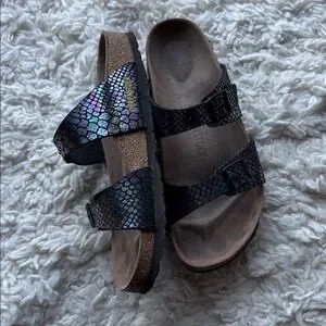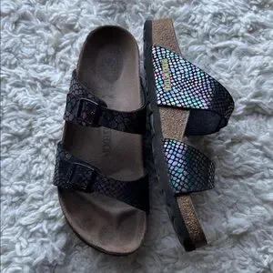These sandals are the Sydney style. Vegan material and iridescent color. Gently used condition. Size EU 40 narrow. Which is about a 9-9.5 US.