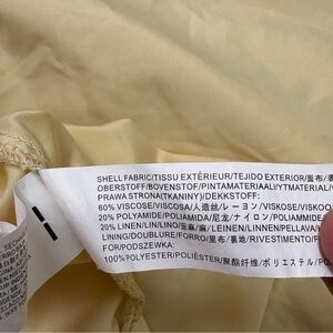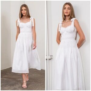 This midi dress features a flattering sweetheart neckline, sleeveless design, and a feminine ruffle trim. The adjustable ribbon tie strap allows for a customizable fit, while the shirred design creates a comfortable A-line silhouette. Made from a blend of viscose, polyamide, and linen, and lined with polyester for added comfort. Perfect for any occasion. Doen style dress