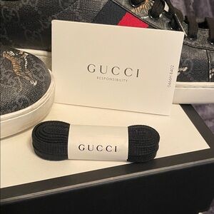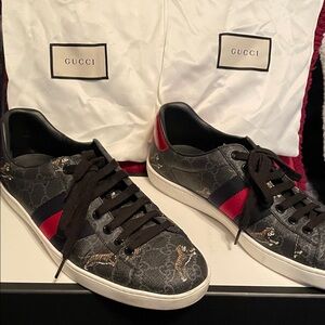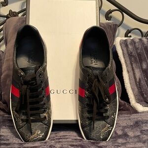 Gucci sneakers with bold red stripe. Black base with unique pattern. Stylish and comfortable.