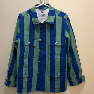 Size small on the tag. Fits more like a large. This jean jacket is brand new with tags. It is an oversized jean jacket. Stylish and vibrant, this striped jean jacket features bold blue and green colors. Perfect for adding a pop of color to any outfit.