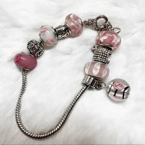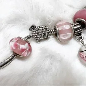 Silver & Pink Glass Bead Charm Bracelet 7-8”