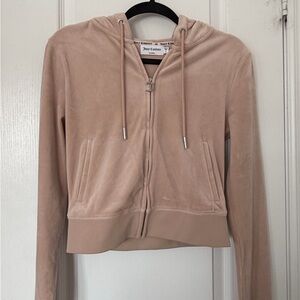 Chic Juicy Couture hoodie in soft beige velour. Features a hood and front pockets.