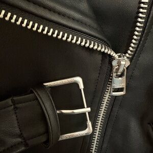 Chic black leather jacket by Calvin Klein Jeans. Features a stylish biker design with zip details. Perfect for a modern look.