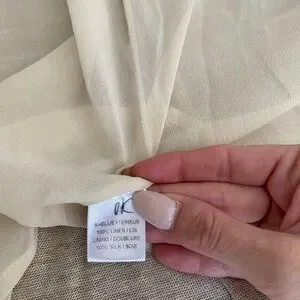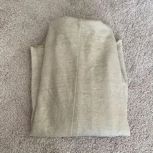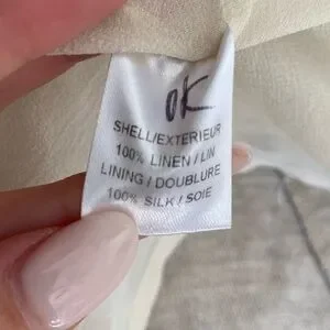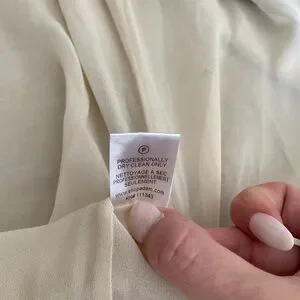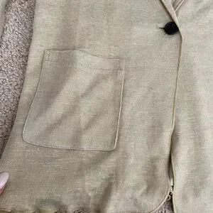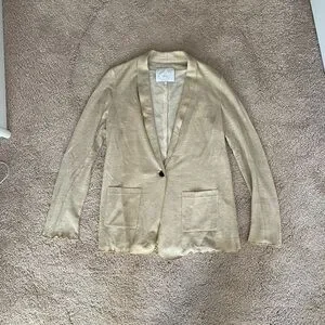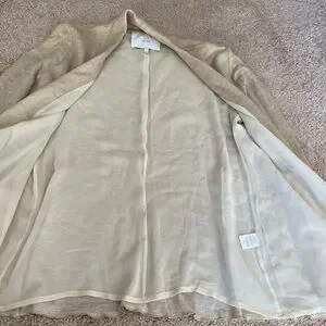 Running and light cardigan sweater from designer Adam Lippes. Beautiful gold metallic outer and lined with an ivory silk. Two front pockets and a brown button. Small mark on back but hardly noticeable