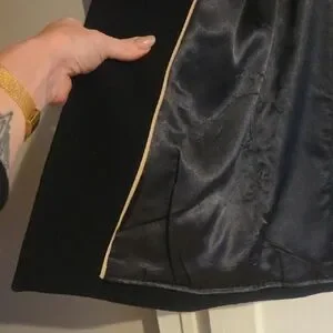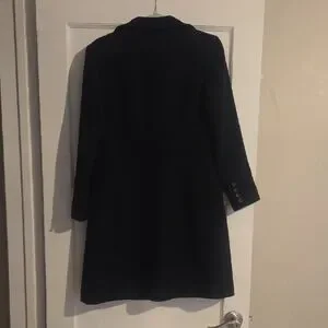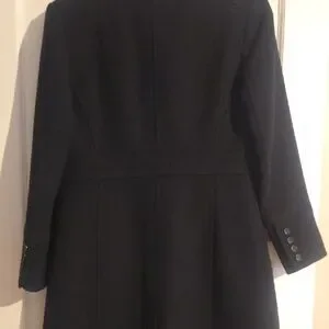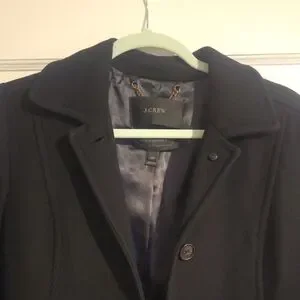 Timeless black collared pea coat by J. Crew. Sleek design with button closure. Sadly does not fit me anymore. Amazing woven cloth, not a felted wool pea coat that attracts lint and is prone to pilling, extremely high quality. One of the pocket linings has a hole but cannot be seen from outside. Just dry cleaned and has not been worn. Excellent condition.