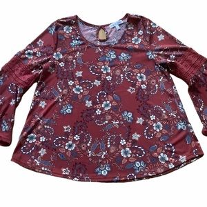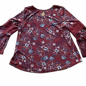 Stem & wine womens burgundy plum floral blouse size large bell sleeve crochet