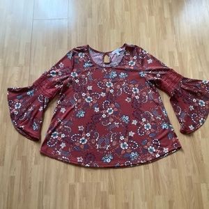 Beautiful plum floral bell sleeve blouse . Crotchet detailing on sleeves . Keyhole on the back.