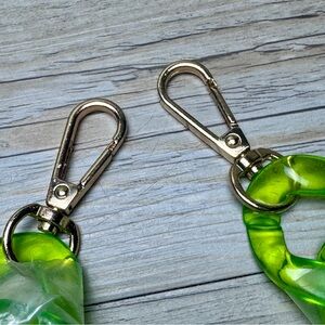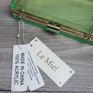 NWT Le Miel Acrylic Green Purse, can be a Crossbody or Handle purse. Chain strap 20” drop. Glows under black light. Mild scratches seen. Overall in great condition. Unique stylish bag, perfect for girls nights out.