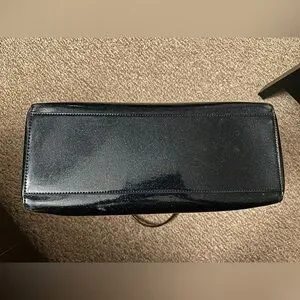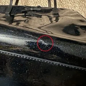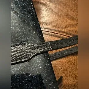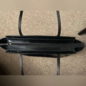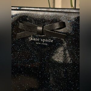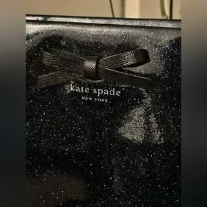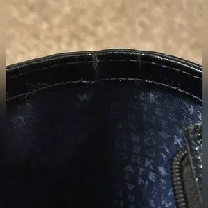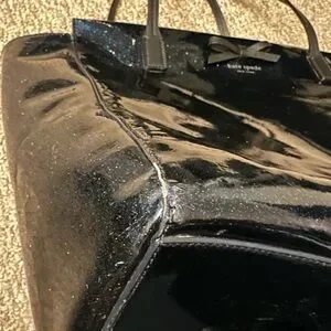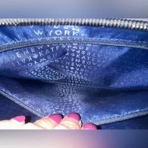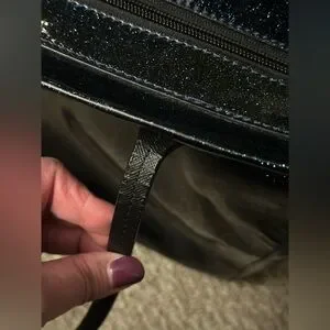 This Kate Spade Mavis Street Taden tote bag is in great used condition. Navy in color with beautiful blue glitter. Inside shows no wear, no stains or rips. Outside shows minimal wear- some scuffs mainly on the bottom and corners. Straps are sturdy but showing some cracking. Top edges also cracking. I took a few photos showing a small rip in the bottom curve of the polyurethane/polyvinyl shell. It does not feel like the rip has gone all the way through to the inside of the bag.