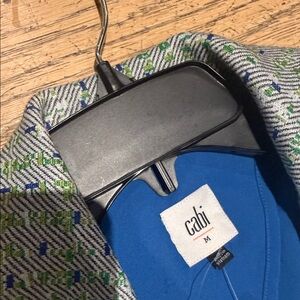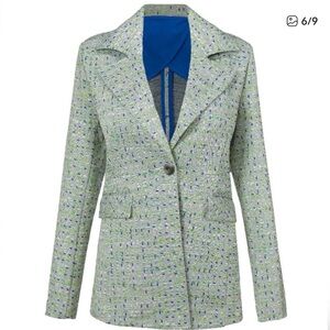 Chic green tweed blazer with striking blue lining. Features a single button closure and front pockets. Ideal for a polished look.