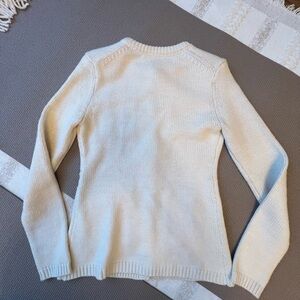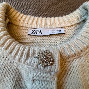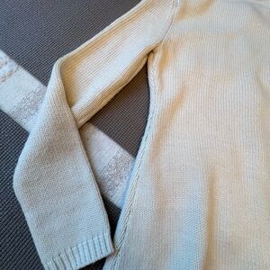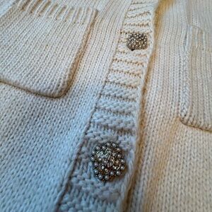 Chic off-white cardigan with button closure. Features four stylish pockets. Ideal for layering.