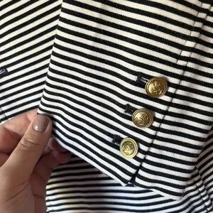 Cabi's cleverly-named Life Jacket is a no-brainer investment in your spring/summer style. This versatile blazer is indeed a jacket for all aspects of life, from a weekend excursion to a business meeting. Lightweight and made from a beautifully soft blend of 67% rayon, 28% nylon and 5% spandex, it's as comfortable as it is visually sublime! Constructed without shoulder pads for a relaxed attitude and unstructured fit, it features a nautical pattern of navy and white horizontal stripes complemented by charming gold crest buttons. These classic and chic buttons have a cool anchor and crown emblem engraved onto them, fitting the sailing theme.