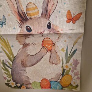Adorable double-sided “Happy Easter” garden flag with a rustic bunny illustration, colorful Easter eggs, butterflies, and festive spring details.