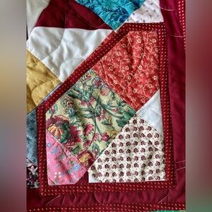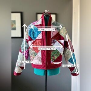 This cozy cropped jacket cardigan was refashioned from a secondhand patchwork quilt. The outside is comprised of multicoloured squares and triangles, while the inside is adorned with pink flowers on a white background. It features a shawl collar; a pair of spacious kangaroo pockets; and coordinating trim finishes in a patterned burgundy. The jacket is boxy with a straight fit through the body, and is perfect for spring and autumn, with its two cotton layers sandwiching an insulating batting layer.