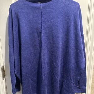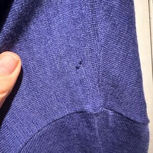 Elegant deep blue turtleneck by Eileen Fisher. Soft and cozy for cool days. ***Flaws-*** pleas look at photos. Small holes on both shoulders. Small, and should be easily fixed. 100% Merino wool.
