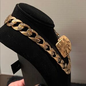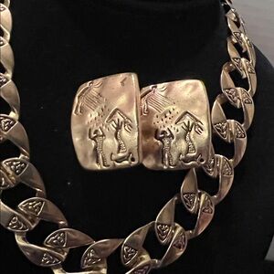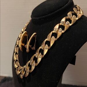 Elegant gold chain necklace and earring set with intricate detailing. Perfect for adding a touch of luxury to any outfit.