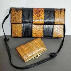 Unusual and striking colour block vintage handbag. Genuine snakeskin. Black and orange-yellowy gold. Skinny black leather strap tied in a loose knot by original owner (the thing to do back in the 80's). Convert to a clutch by slipping strap inside. comes with matching snakeskin wallet. Both are in excellent condition. Some minor signs of age and use of course but no damage, rips, stains or odors. Smaller sized...Measurements to be posted soon.
