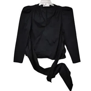 Zara Poplin Mock Wrap Blouse Size XL Black Long Puffy Sleeves Tie at the Waist