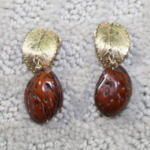 Vintage Napier Gold-tone Leaf & Brown Seed Drop Pit Earrings Signed