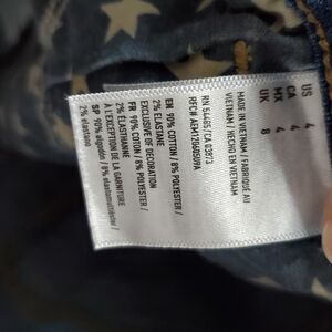 Trendy distressed jean shorts with star and stripe accents. Ideal for casual wear.