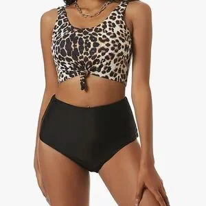 Bold leopard print top with a stylish knot. Sleek black high-waisted bottoms. Perfect for a standout beach look.