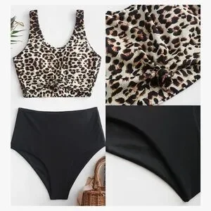 Knotted Tankini Set: Zaful tankini swimsuits with padded bra, knot front, high rise, high cut, high waist, tummy control and classic leopard and solid print