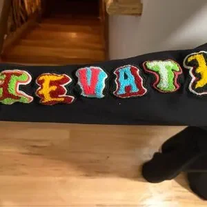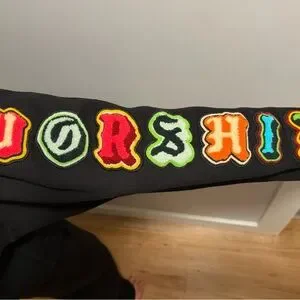 Black hoodie with colorful lettered design. Features bold, multicolored letters on the front and sleeves.