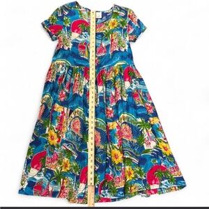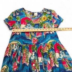 Vintage Bila colorful travel print midi dress from the 1990s featuring a lightweight crinkle gauze texture and relaxed bohemian silhouette — perfect for summer, vacation, or festival wear.