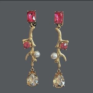OSCAR de la RENTA Gold Pink Crystal Pearl Flora Branch Drop Earrings Branch
