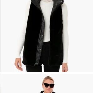 Stylish reversible black faux fur vest by Tuckernuck. Features a sleek design. Perfect for layering. Small tear inside pocket.