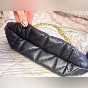 Stylish black quilted shoulder bag with a bold gold chain strap. Perfect for adding a touch of elegance to any outfit.