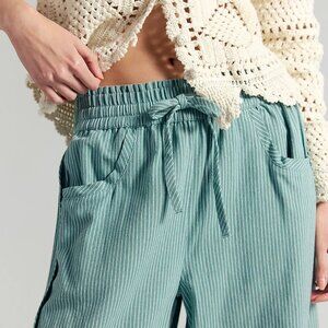 Perfectly printed and just as easy, these wear-everywhere pants feature a subtle barrel silhouette with micro stripe pattern throughout and raw-edge seams for added texture. Color is Blue Trellis-Nilla Cream. Size M.