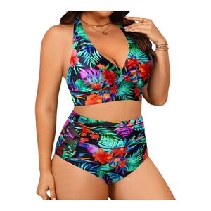 Dive into summer with this vibrant tropical floral halter bikini set. Featuring a stunning mix of colors, this swimwear is perfect for making a splash at the beach or pool.