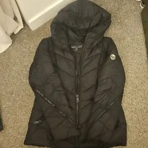black puffy jacket with a hood in great condition. full zip, and has zippers on the sleeves to expand the lower part of the sleeve. Also packs down into an internal sack