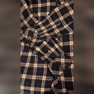 Navy plaid shirt with red and white accents. Features floral embroidery on the collar. Casual and stylish. EUC from my personal closet to yours with love ❤️. No frilling all buttons intact, embroidery is intact. Beautiful and cared for.