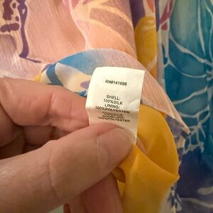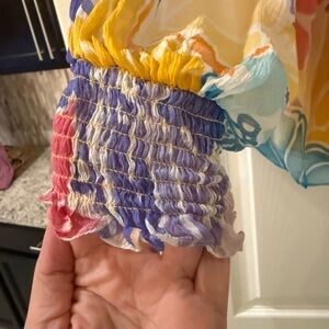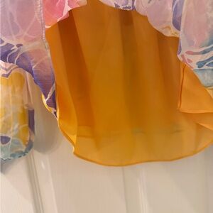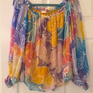 Brighten your wardrobe with this off-shoulder 100% silk blouse. Features a vibrant floral pattern in pink, orange, and blue. Perfect for casual outings. From Saks and other is so luxurious! Retailed for $345. Measures 16 1/2” pit to pit and 19” from top collar to bottom hem. Nonsmoking home.