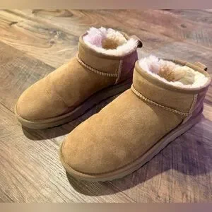 Warm and stylish tan suede ankle Ugg boots with plush lining. Bought earlier this fall brand new from Ugg. My daughter’s feet grew and these no longer fit. They are in great condition with some basic wear.