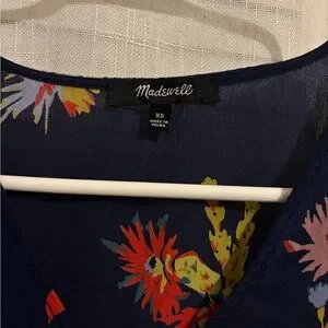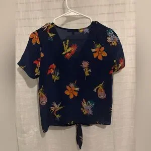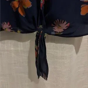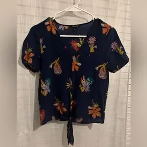 Beautiful and lightweight, this Madewell top is made from 100% silk and features a vibrant floral print on a deep navy background. The tie-front detail adds a fun, flattering touch — perfect for dressing up jeans or pairing with skirts.