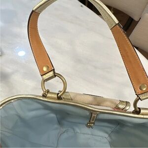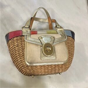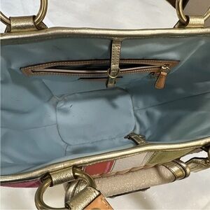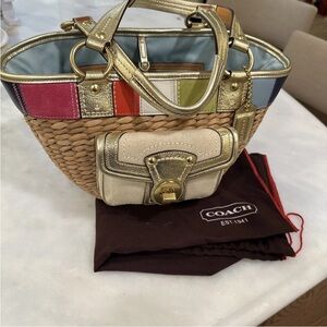 Elegant Coach tote with gold accents and multicolor patchwork. Features a stylish straw design. Ideal for any occasion.