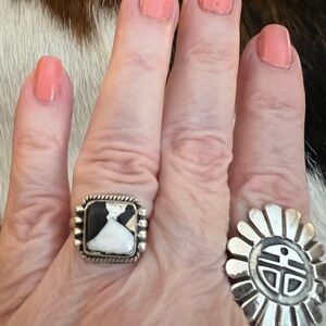 This particular design is characteristic of Navajo artistry, often incorporating traditional stamp work and hand-finished details to highlight the natural patterns of the stone. Designed for versatility, the ring includes a 2.6 mm adjustable band, allowing it to fit various sizes from 5 to 7.5 while maintaining its bold, statement-making presence.