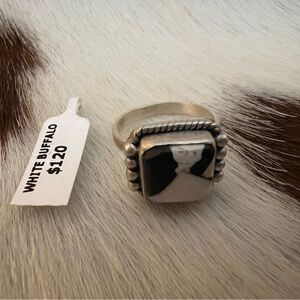 ❤️ White Buffalo Turquoise Square 925 Ring Navajo Style Matte ADJ SZ 5 to 7.5