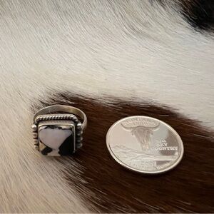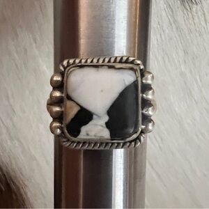 This handcrafted ring features a striking White Buffalo stone, a unique mineral known for its high-contrast white coloration and dramatic black veining. Set in a square matte brushed sterling silver mounting, the stone is secured by a smooth silver bezel and framed by an ornate twist wire border. The sides of the setting are further detailed with small silver beads, typical of Southwestern or Navajo-style jewelry. True to its quality craftsmanship, the piece is hallmarked "Sterling" on the reverse to denote its solid .925 silver composition.