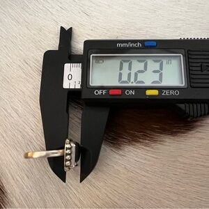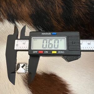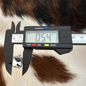 The face of the ring measurements, as seen in the photos, are .54”L x .60”W x .23”D. The ring weighs 4.5 Grams.