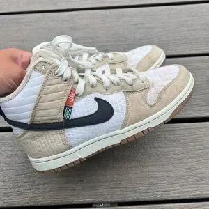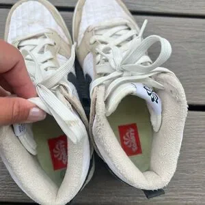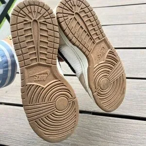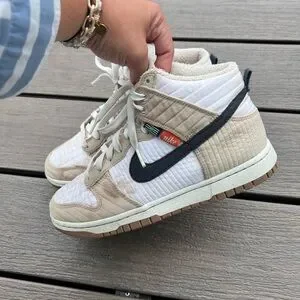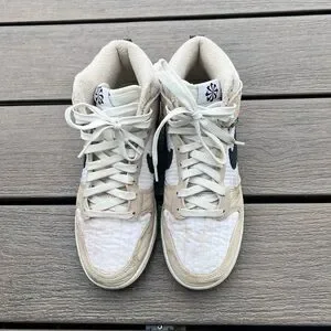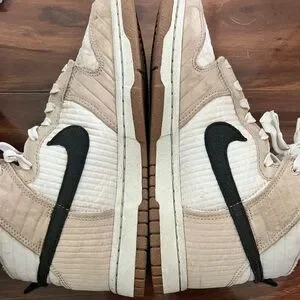 Nike high-tops with a sleek tan and white design. Ideal for everyday style. These have some stains but they’re barely worn, haven’t tried to clean them, but maybe you can. My loss your gain. Thanks for shopping